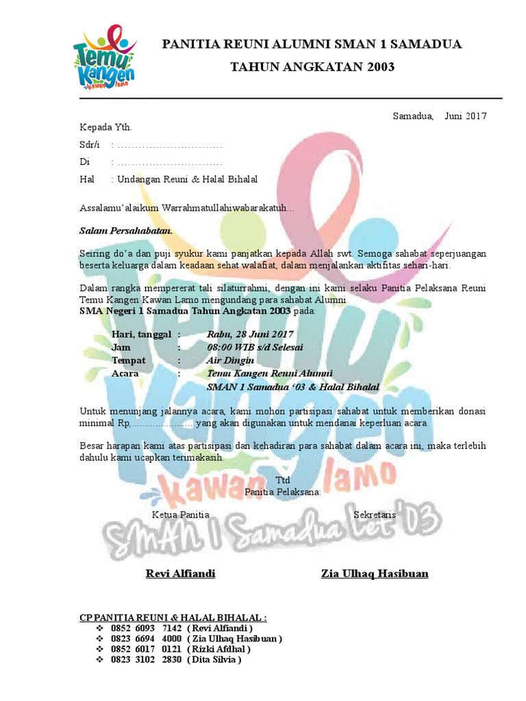 Proposal adalah pengajuan dana untuk sebuah kegiatan yang diadakan disekolah, tempat ibadah, ataupun kegiatan umum di masyarakat. Tips sukses acara reuni by apresiasi alumni untuk sekolah1. Reuni 1 dekade smp negeri 1 blitarlulusan 200510 years and still countinga. Komite sekolah kepala sekolah ketua ( nama komite yayasan.) (nama kepala sekolah) mengetahui : Maka dari itu, kami selaku pihak organisasi siswa intra sekolah atau osis mewakili suara para. Demikian proposal ini kami buat sebagai sebuah acuan contoh penutup proposal reuni. Selanjutnya adalah contoh untuk proposal kegiatan sekolah. Kegiatan sekolah, usaha, pengajuan dana, kewirausahaan, pembangunan proposal kegiatan pramuka. Anak sekolah seperti pelajar, mahasiswa, bahkan orang tua yang berprofesi di dunia bisnis atau di perusahaan pasti tidak asing. Atas perhatian dan kerjasamanya kami haturkan banyak terima kasih. Contoh proposal terlengkap dari kegaiatan sekolah berupa pameran, acara pramuka, pentas seni, sampai dengan acara bakti sosial. Proposal reuni smp n painan angkata. Text of contoh proposal reuni smp.